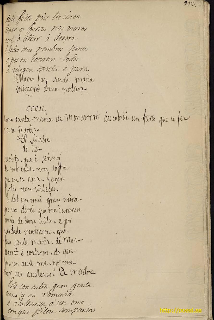 CANTIGA CCCII. Copia d' las Cantigas del rey don Alfonso el Sabio según los 2 códices del Escorial con las notas citas e índices de los mismos para la publicación q proyectaba Florencio Janer. Biblioteca Nacional de España. Madrid, (Mss. 5.982) ![]() ![]() ![]() |