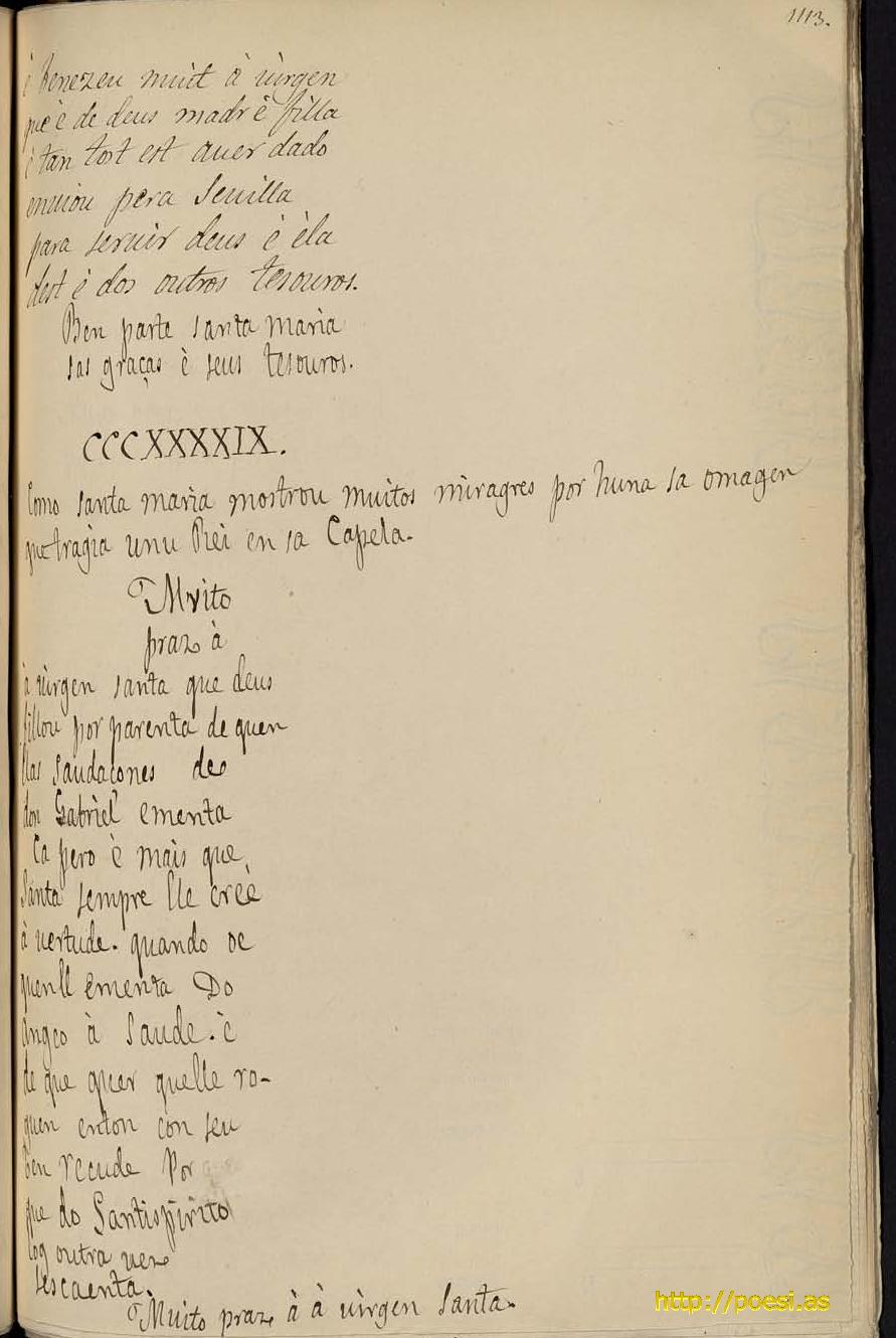 CANTIGA CCCXLIX [ = CCCLXXXVII ]. Copia d' las Cantigas del rey don Alfonso el Sabio según los 2 códices del Escorial con las notas citas e índices de los mismos para la publicación q proyectaba Florencio Janer. Biblioteca Nacional de España. Madrid, (Mss. 5.982) ![]() ![]() ![]() |