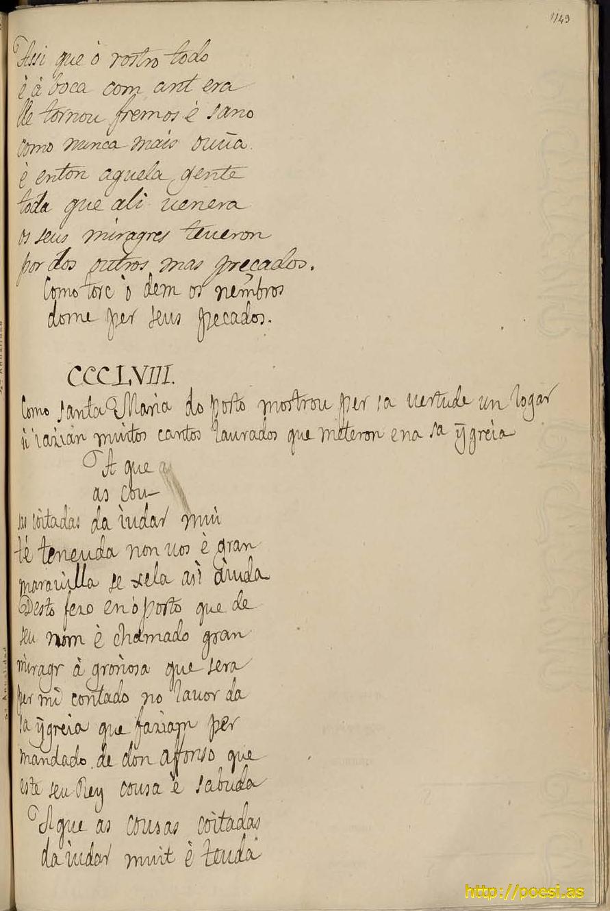 CANTIGA CCCLVIII. Copia d' las Cantigas del rey don Alfonso el Sabio según los 2 códices del Escorial con las notas citas e índices de los mismos para la publicación q proyectaba Florencio Janer. Biblioteca Nacional de España. Madrid, (Mss. 5.982) ![]() ![]() ![]() |