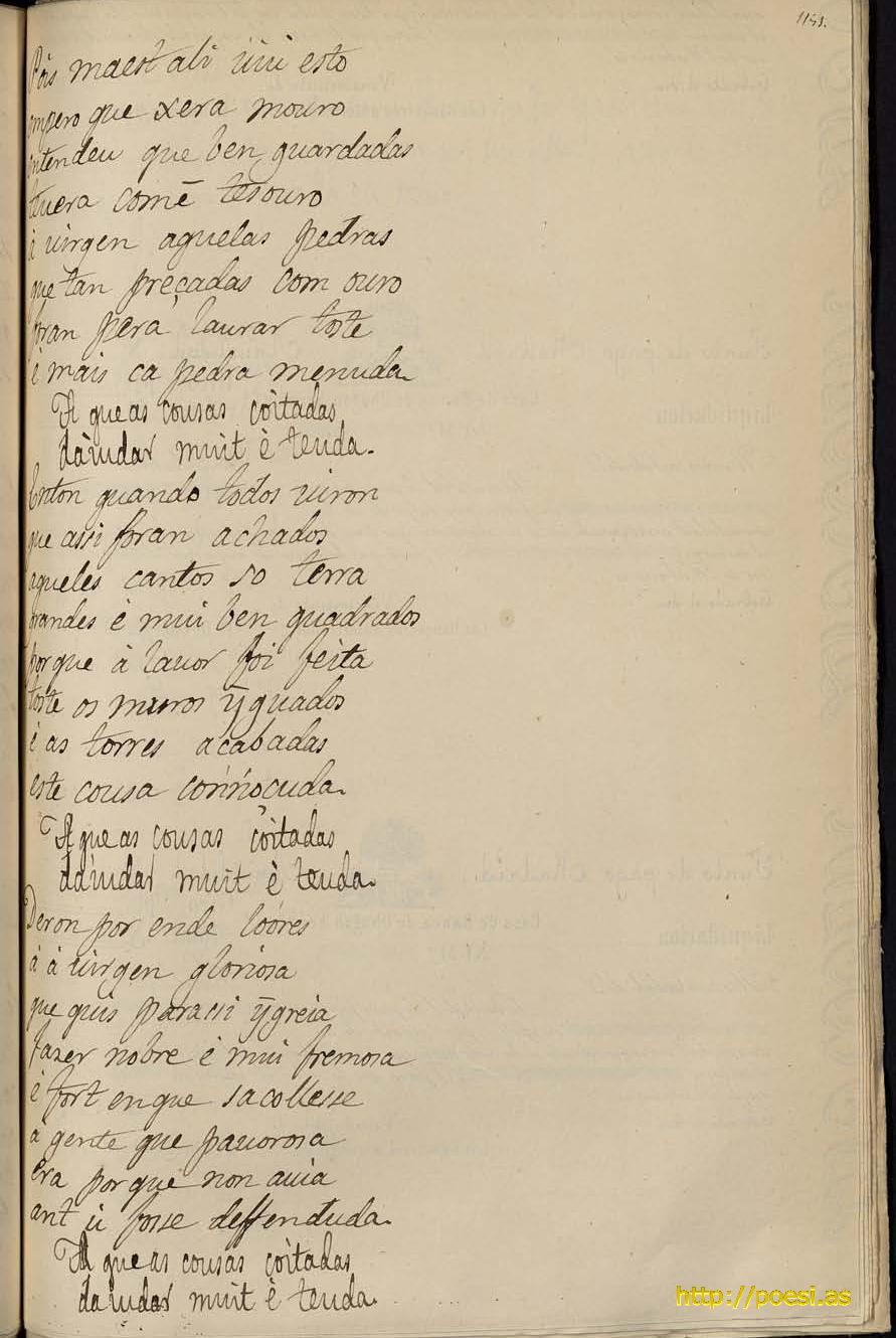 Incluido en Copia d' las Cantigas del rey don Alfonso el Sabio según los 2 códices del Escorial con las notas citas e índices de los mismos para la publicación q proyectaba Florencio Janer. Biblioteca Nacional de España. Madrid, (Mss. 5.982)