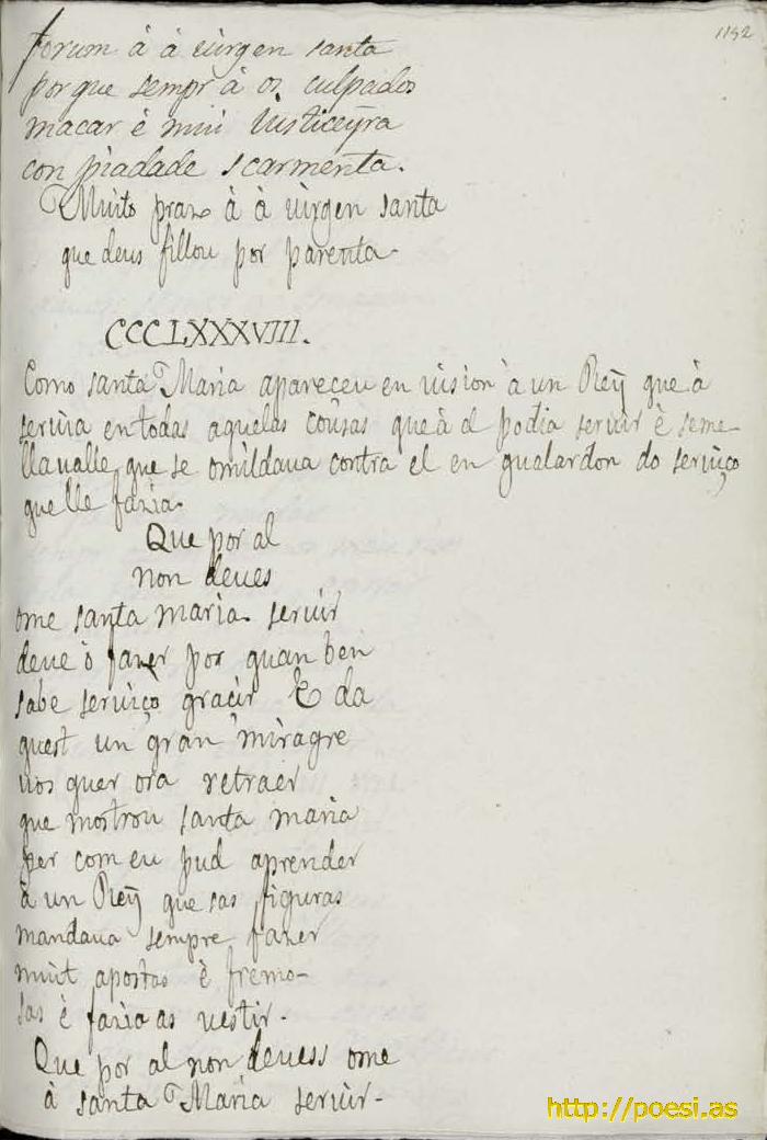 CANTIGA CCCLXXXVIII [ = CCXCV ]. Copia d' las Cantigas del rey don Alfonso el Sabio según los 2 códices del Escorial con las notas citas e índices de los mismos para la publicación q proyectaba Florencio Janer. Biblioteca Nacional de España. Madrid, (Mss. 5.982) ![]() ![]() ![]() ![]() ![]() ![]() |